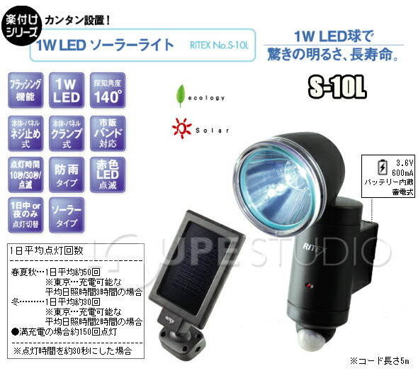 (点灯時間を約30秒に設定した場合) LEDソーラーライト 1W ライテックスシリーズ S-10L MUSASHI [ムサシ] ソーラーライト 明るい スポットライト 人感センサー 照明 防犯スペック商品名LEDソーラーライト 1W S-10L商品番号S-10L本体サイズW67×H188×D147mm(クランプ除く)ソーラーパネルのサイズW98×H196×D50mm(クランプ除く)重量約300g(クランプ除く)電源ソーラーパネル0.33Wニッカド電池搭載3.6V- 600mA電球タイプ高輝度1W LED球(白熱電球約10W相当の明るさ) センサー機能・探知角度(最大):140°・探知距離(最大):6m・点灯時間調整機能:約10秒/約30秒/約30秒の点滅・昼夜切替機能コード長本体とパネルを繋ぐコード約5m取付方法ネジ取付、クランプ取付(Lボルト1本式)、市販バンド対応その他・防雨タイプ・待機中本体LEDが点滅して威嚇・探知フラッシングモード(ワンタッチ切替)・LEDが充電不足をお知らせ ムサシ S-10L※仕様及び外観は改善のため、予告なく変更することがあります。