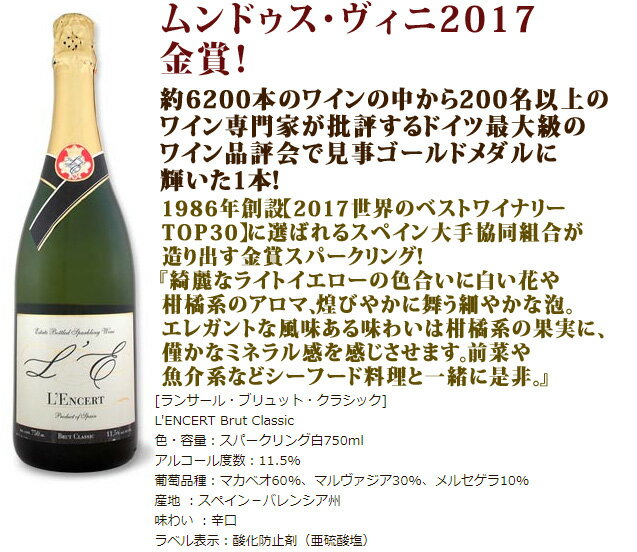 全国一律送料無料!! こちらのセットとあわせて当店内の他のワインを追加で お買い物いただいても送料が無料となります!! 是非、この機会にご利用ください!! セット内容 : 白スパークリング750ml x 6本 1本目 ラ・ロスカ・カバ・ブリュット La Rosca Cava Brut 色・容量 スパークリング白750ml アルコール 11.5% ブドウ品種 マカベオ、チャレッロ、パレリャーダ 産地 スペイン−カタルーニャ州 味わい 辛口 ラベル表示 酸化防止剤(亜硫酸塩) 2本目 ランサール・ブリュット・クラシック L'ENCERT Brut Classic 色・容量 スパークリング白750ml アルコール 11.5% ブドウ品種 マカベオ60%、マルヴァジア30%、メルセゲラ10% 産地 スペイン−バレンシア州 味わい 辛口 ラベル表示 酸化防止剤(亜硫酸塩) 3本目 グリジオロッソ・ヴィノ・スプマンテ・ブリュット Grigiorosso Spumante Brut 色・容量 スパークリング白750ml アルコール 11.0% ブドウ品種 トレッビアーノ70%、ガルガネーガ30% 産地 イタリアーロンバルディア州 味わい 辛口 ラベル表示 酸化防止剤(亜硫酸塩)、安定剤(アカシア、CMC-Na)、酸味料(クエン酸) 4本目 コント・ド・モン・ルイ・ブリュット Comte de Mont Louis Brut 色・容量 スパークリング白750ml アルコール 11.0% ブドウ品種 セミヨン50%、シャルドネ30%、ユニ・ブラン20% 産地 フランス−ヴァン・ムスー 味わい 辛口 ラベル表示 酸化防止剤(亜硫酸塩)、安定剤(アカシア) 5本目 ルイ・フィリベール・ブラン・ド・ブラン・ブリュット Louis Philibert Blanc de Blancs Brut 色・容量 スパークリング白750ml アルコール 11.0% ブドウ品種 セミヨン50%、ユニブラン41%、コロンバール5%、シャルドネ2%、ミュスカ2% 産地 フランス−ヴァン・ムスー 味わい 辛口 ラベル表示 酸化防止剤(亜硫酸塩)、安定剤(アカシア) 6本目 ベルモン・ブラン・ド・ブラン・ブリュット・プレステージ Belmont Blanc de Blancs Brut Prestige 色・容量 スパークリング白750ml アルコール 10.5% ブドウ品種 ユニ・ブラン50%、アイレン50% 産地 フランス−ヴァン・ムスー 味わい 辛口 ラベル表示 酸化防止剤(亜硫酸塩、ビタミンC)、安定剤(CMC-Na)当店厳選辛口泡6本!1本当たり797円(税別)! スペインの瓶内2次発酵をメインに 当店オススメの辛口スパークリングばかり揃えた お買い得6本セット!! どれも大好評頂いている人気泡ばかり! キッチリ辛口!しっかり泡!充実の味わい! お得に贅沢スパークリング祭り!! 普段飲みに!パーティに! シーンを選ばずたっぷりお使い頂けます! スパークリングのある幸せなひとときを 是非ともお過ごし下さい! 【送料無料】第54弾!泡祭り! 当店厳選辛口スパークリングワイン6本スペシャルセット! [ラ・ロスカ・カバ・ブリュット]La Rosca Cava Brut 色・容量:スパークリング白750ml アルコール度数:11.5% 葡萄品種:マカベオ、チャレッロ、パレリャーダ 産地 :スペイン−カタルーニャ州 味わい :辛口 ラベル表示:酸化防止剤(亜硫酸塩) [ランサール・ブリュット・クラシック]L'ENCERT Brut Classic 色・容量:スパークリング白750ml アルコール度数:11.5% 葡萄品種:マカベオ60%、マルヴァジア30%、メルセゲラ10% 産地 :スペイン−バレンシア州 味わい :辛口 ラベル表示:酸化防止剤(亜硫酸塩) [グリジオロッソ・ヴィノ・スプマンテ・ブリュット]Grigiorosso Spumante Brut 色・容量:スパークリング白750ml アルコール度数:11.0% 葡萄品種:トレッビアーノ70%、ガルガネーガ30% 産地 :イタリアーロンバルディア州 味わい :辛口 ラベル表示:酸化防止剤(亜硫酸塩)、安定剤(アカシア、CMC-Na)、酸味料(クエン酸) [コント・ド・モン・ルイ・ブリュット]Comte de Mont Louis Brut 色・容量:スパークリング白750ml アルコール度数:11.0% 葡萄品種:セミヨン50%、シャルドネ30%、ユニ・ブラン20% 産地 :フランス−ヴァン・ムスー 味わい :辛口 ラベル表示:酸化防止剤(亜硫酸塩)、安定剤(アカシア) [ルイ・フィリベール・ブラン・ド・ブラン・ブリュット]Louis Philibert Blanc de Blancs Brut 色・容量:スパークリング白750ml アルコール度数:11.0% 葡萄品種:セミヨン50%、ユニブラン41%、コロンバール5%、シャルドネ2%、ミュスカ2% 産地 :フランス−ヴァン・ムスー 味わい :辛口 ラベル表示:酸化防止剤(亜硫酸塩)、安定剤(アカシア) [ベルモン・ブラン・ド・ブラン・ブリュット・プレステージ]Belmont Blanc de Blancs Brut Prestige 色・容量:スパークリング白750ml アルコール度数:10.5% 葡萄品種:ユニ・ブラン50%、アイレン50% 産地 :フランス−ヴァン・ムスー 味わい :辛口 ラベル表示:酸化防止剤(亜硫酸塩、ビタミンC)、安定剤(CMC-Na)