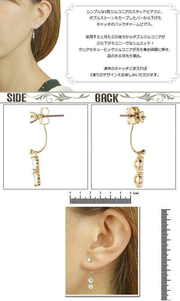 スタッドピアス 2WAY バックチャーム チタン製ポスト フリンジ 1粒スタッド キュービックジルコニア ダブルストーン 通常キャッチセット レディース デイリー キュート かわいい メール便送料無料 販売期間限定セール