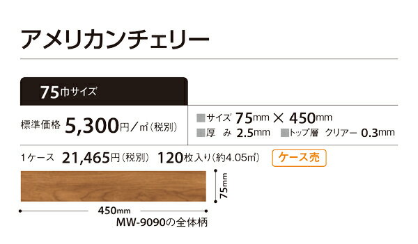 こちらのページでは WOOD アメリカンチェリー W-9090,MW-9091【75巾サイズ 75mm x 450mm】 が床材専門店の特価でご購入頂けます。